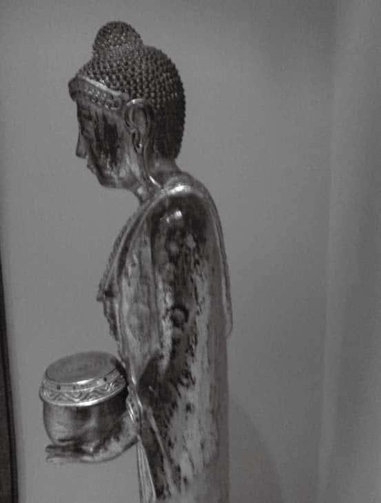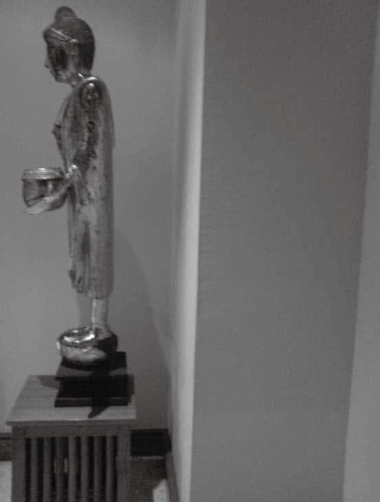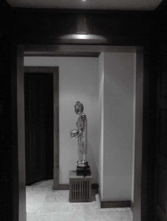 屋内走廊尽头有一尊站立的金佛,低眉、闭目,满脸慈悲。白天看去没啥感觉,夜里坐在沙发上听音乐,隔远望去,竟觉屋子里有了生机,他在陪伴,也在开示,只在于你有没有注意聆听。